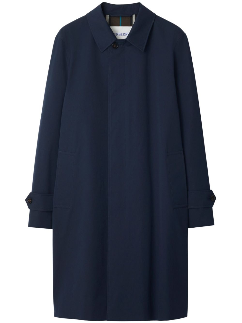 water-resistant cotton car coat Highlights - Midnight blue - Cotton - Gabardine weave - Water-resistant - Classic collar - Long sleeves with buttoned cuffs - Two front welt pockets - Rear slit - Straight hem - Vintage check-pattern lining - Concealed front button fastening Made in United Kingdom Composition Lining: Cotton 100% Outer: Cotton 100%, Buffalo Horn 100%