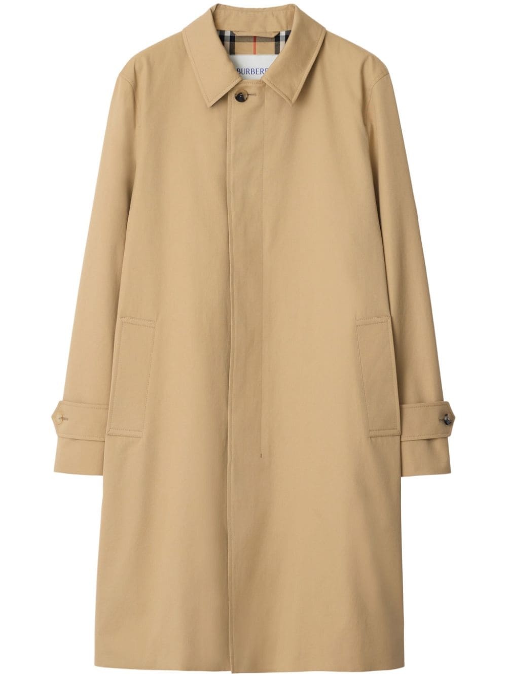 water-resistant cotton car coat Highlights - Archive beige - Cotton - Gabardine weave - Water-resistant - Classic collar - Long sleeves with buttoned cuffs - Two front welt pockets - Rear slit - Straight hem - Vintage check-pattern lining - Concealed front button fastening Made in United Kingdom Composition Outer: Cotton 100%, Buffalo Horn 100% Lining: Cotton 100%