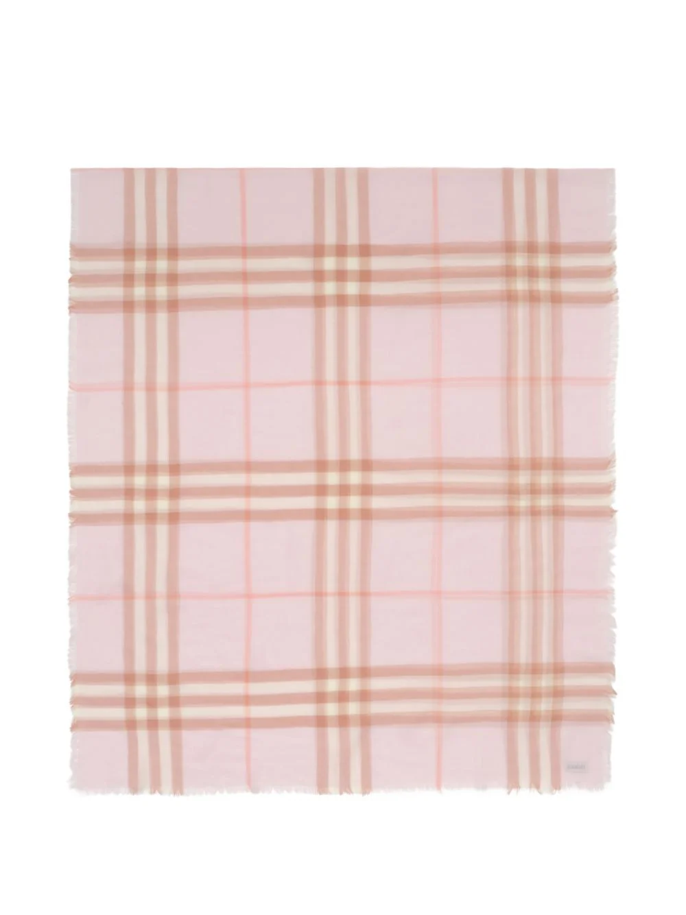 wide check wool scarf Highlights - A lightweight wool scarf made in italy. the design is woven with the burberry check in summery quartz pink. - Rectangular - Eyelash fringing at the edges Made in Italy Composition Wool 100% SIZE & FIT Measurement LENGTH 78.74 in(200 cm) WIDTH 35.43 in(90 cm) Washing instructions Dry Clean Only