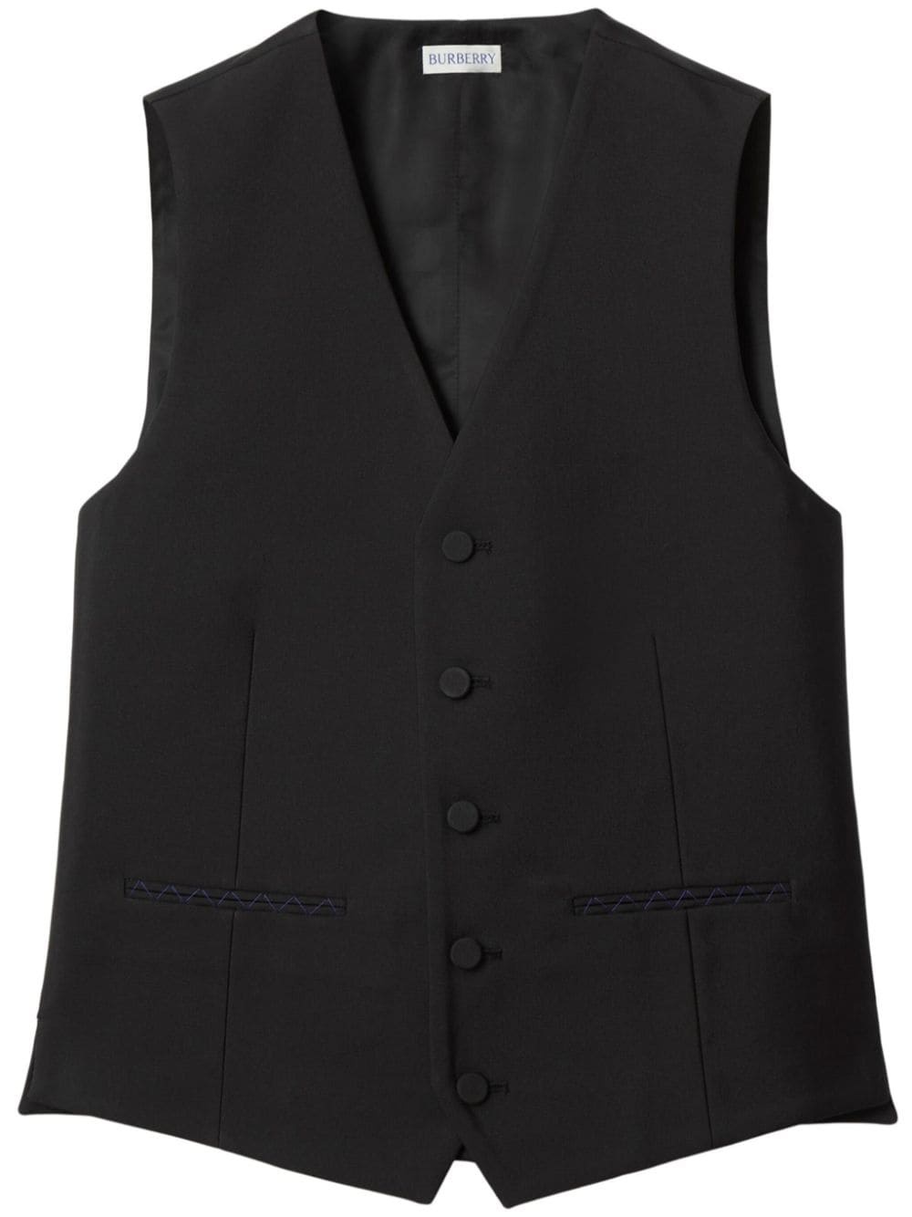 wool-silk blend waistcoat Highlights - Black - Wool-silk blend - Crepe texture - V-neck - Front button fastening - Two front welt pockets - Decorative stitching - Adjustable buckle strap at rear - Full lining Made in Italy Composition Outer: Wool 60%, Silk 40% Lining: Cupro 100%