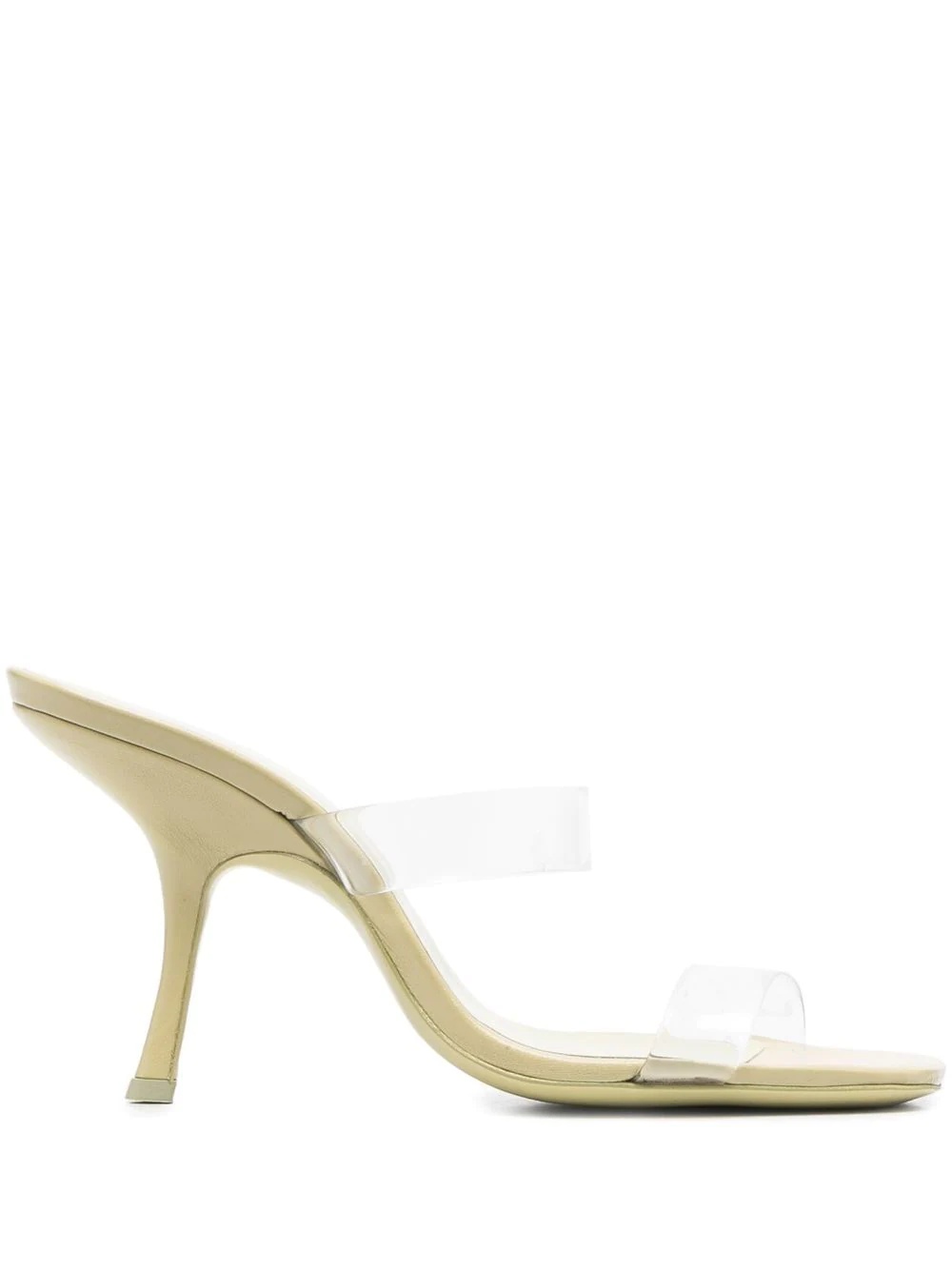 Clara sandals Famed for their iconic accessories and footwear designs, By Far introduces the Clara mules in a soft yellow hue for SS22. Set atop a high heel, the pair is given a fresh look thanks to two sheer straps. Highlights - Olive green - Leather - Branded insole - Open toe - Slip-on style - High heel Imported Composition Outer: Leather 100%, PVC 100% Lining: PVC 100% Sole: Leather 100%