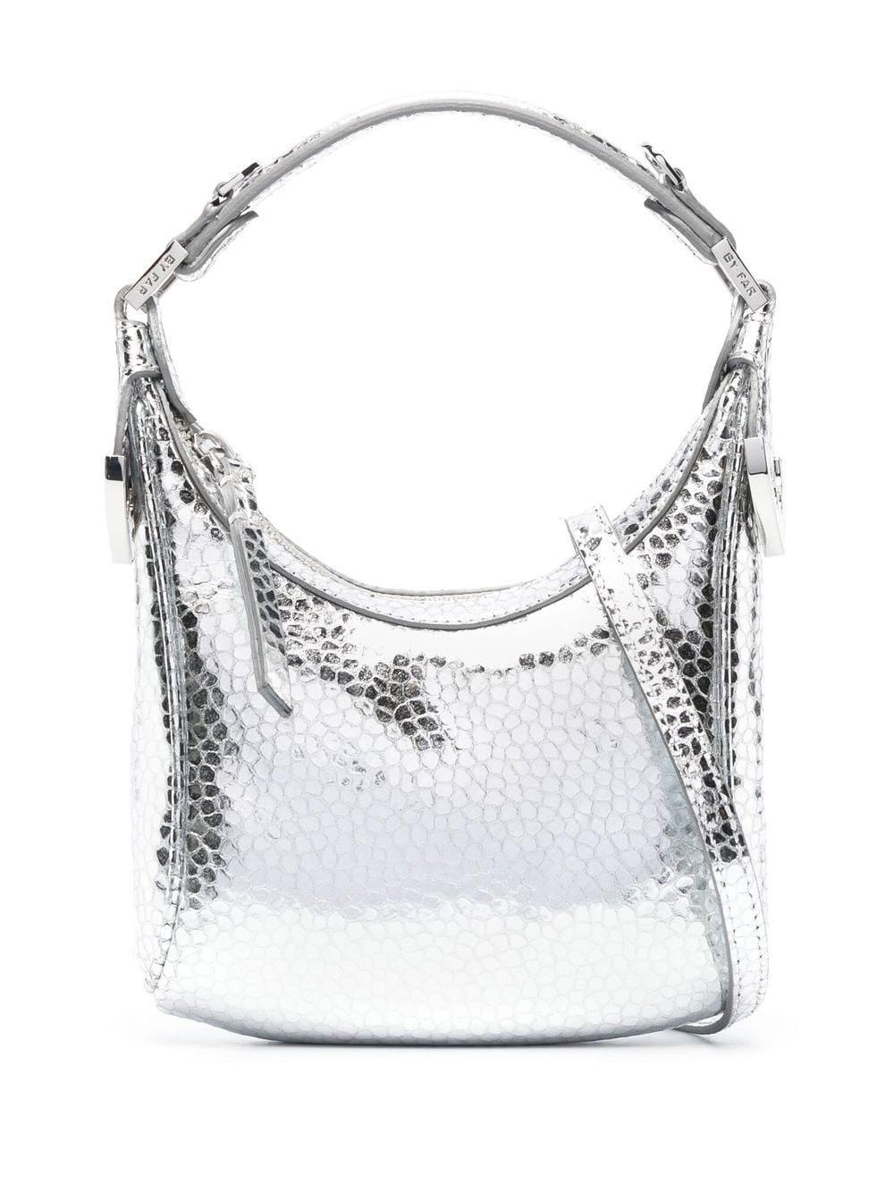 Cosmo metallic top-handle bag Reimagined for SS23 in a glistening metallic finish, BY FAR's Cosmo bag nods to a futuristic aesthetic. Crafted from silver-tone goatskin, this compact accessory features matching-coloured hardware, a top handle and a practical zip fastening, as well as a detachable and adjustable strap giving you the option to wear it over the shoulder or across the body. Imported Composition Outer: Goat Skin 100% Lining: Cotton 100% SIZE & FIT Model measurements Height 5 ft 11 in(1.8 m) Bust/Chest 31.49 in(80 cm) Hips 36.61 in(93 cm) Waist 24.4 in(62 cm) Measurement DEPTH 1.96 in(5 cm) HANDLE 5.51 in(14 cm) HEIGHT 5.11 in(13 cm) STRAP 24.4 in(62 cm) WIDTH 6.29 in(16 cm)