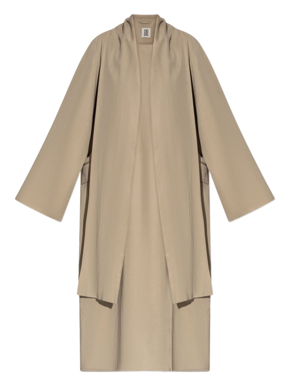 draped open-front coat Highlights - Beige - Open front - Draped design - Three-quarter sleeves - Wide sleeves - Embroidered logo detail Imported Composition Lyocell 83%, Linen/Flax 17% Washing instructions Read Manufacturer Guidelines