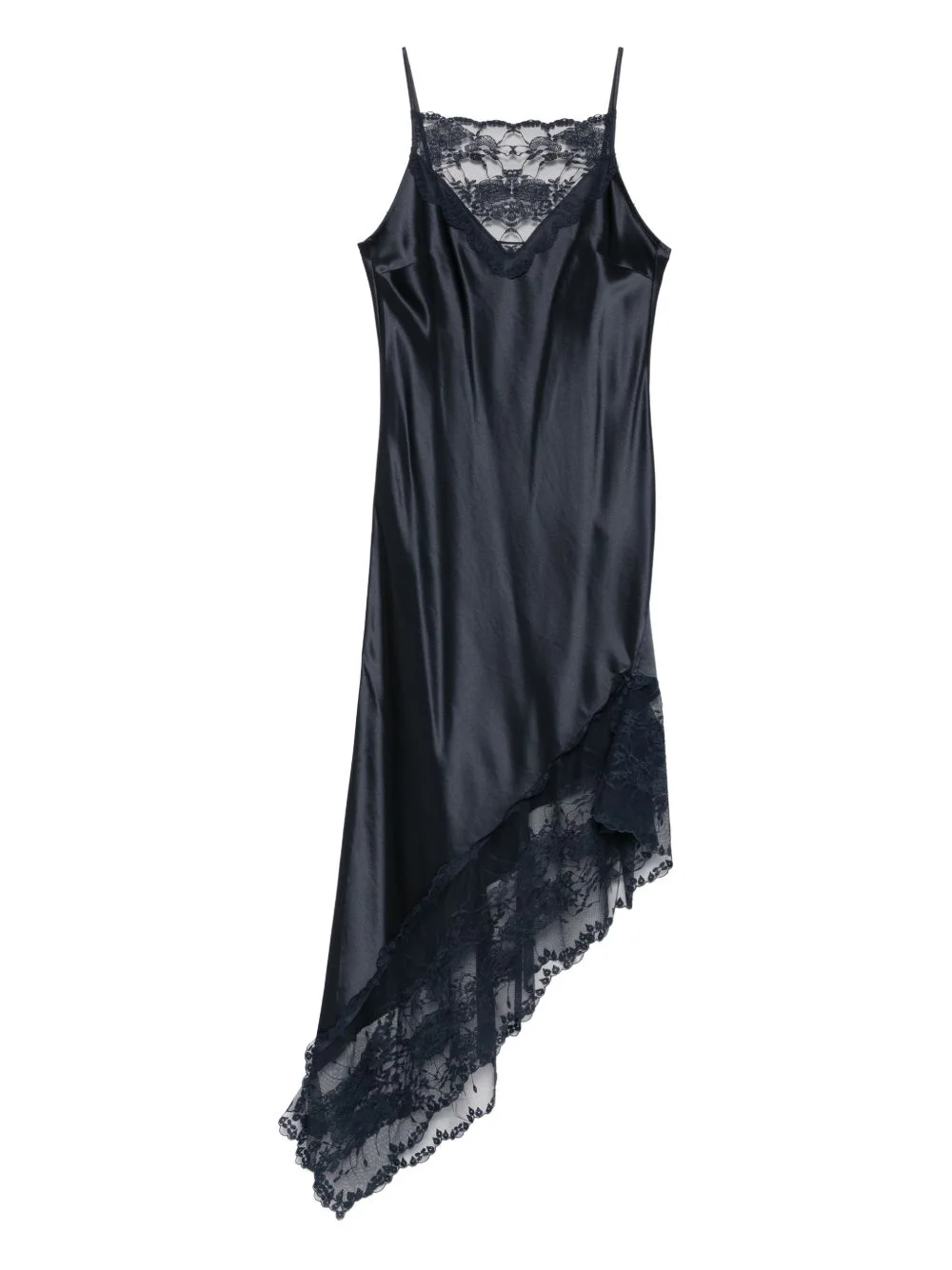 Laynee lace asymmetric dress Highlights - Dark blue - Lace trim - Asymmetric hem - Thin straps - Sleeveless Imported Composition Polyamide 100%, Acetate 76%, Polyester 24% SIZE & FIT Model measurements Height 5 ft 10 in(1.78 m) Bust/Chest 33.46 in(85 cm) Hips 36.22 in(92 cm) Waist 23.22 in(59 cm) Washing instructions Machine Wash