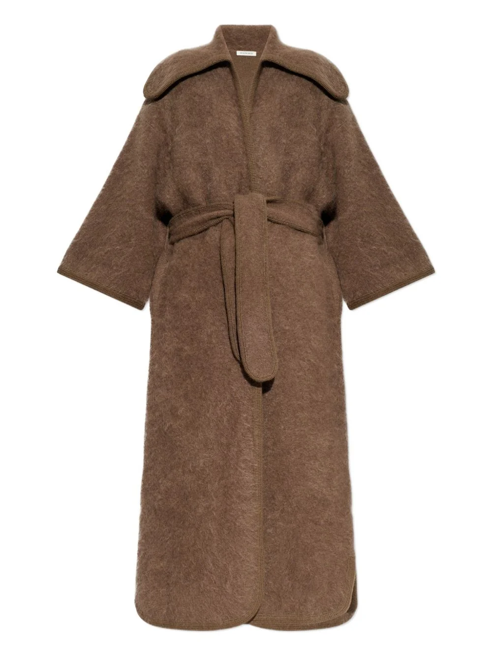 Mirano belted coat Highlights - Brown - Wide sleeves - Detachable belt - Round neck - Long length - Shawl lapels Imported Composition Wool 57%, Mohair 30%, Polyamide 11%, Spandex/Elastane 2% Washing instructions Read Manufacturer Guidelines