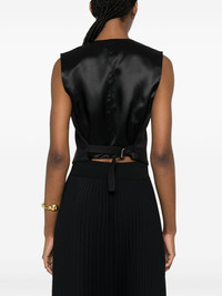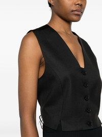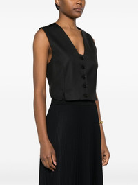 V-neck single-breasted waistcoat Highlights - Black - Recycled polyester blend - V-neck - Front button fastening - Sleeveless - Straight hem Imported Composition Outer: Recycled Polyester 69%, Viscose 30%, Elastane 1% Lining: Viscose 100% SIZE & FIT Model measurements Height 5 ft 11 in(1.8 m) Bust/Chest 31.49 in(80 cm) Hips 36.61 in(93 cm) Waist 24.4 in(62 cm) FittingInformation Designed for a slim fit that sits just away from the body offering a close yet comfortable fit The adjustable tabs allow for fitted preferences Made from a midweight fabric This piece fits true to size – take your usual size Washing instructions Dry Clean Only