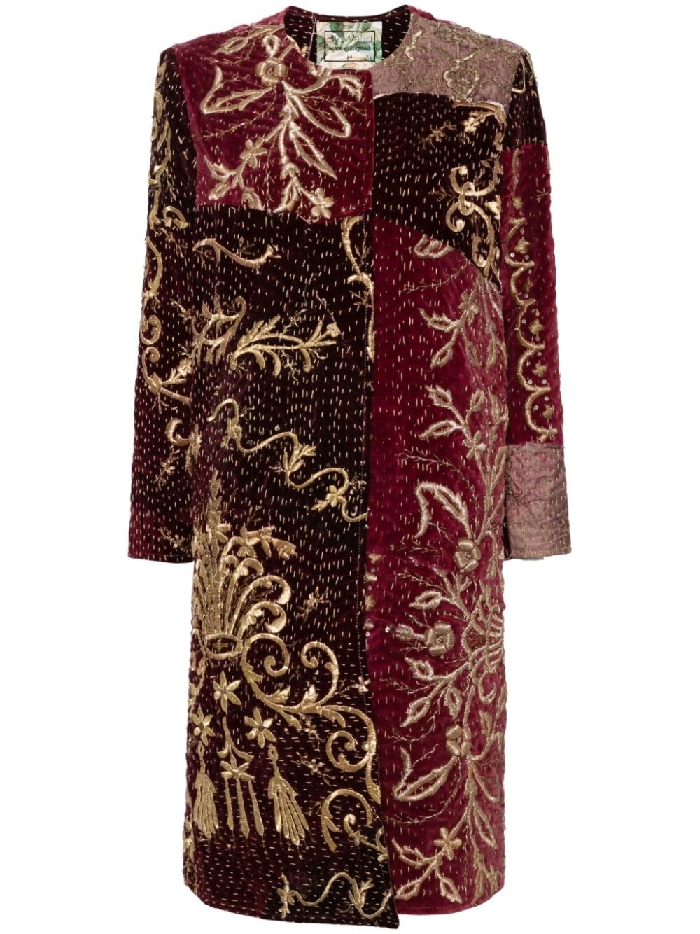 Tanita coat Highlights - Burgundy/multicolour - Silk - Velvet - Patchwork design - Embroidered design - Concealed front press-stud fastening - Round neck - Collarless - Long sleeves - Full lining - The item you receive may differ slightly from the one pictured. each piece is unique and may vary in wash and texture. Made in United Kingdom Composition Outer: Silk 100% Lining: Acetate 100% SIZE & FIT Model measurements Height 5 ft 9 in(1.76 m) Bust/Chest 31.1 in(79 cm) Hips 35.03 in(89 cm) Waist 24.4 in(62 cm) FittingInformation Designed to be unstructured, offering a loose fit throughout Made from a heavyweight non-stretch fabric
