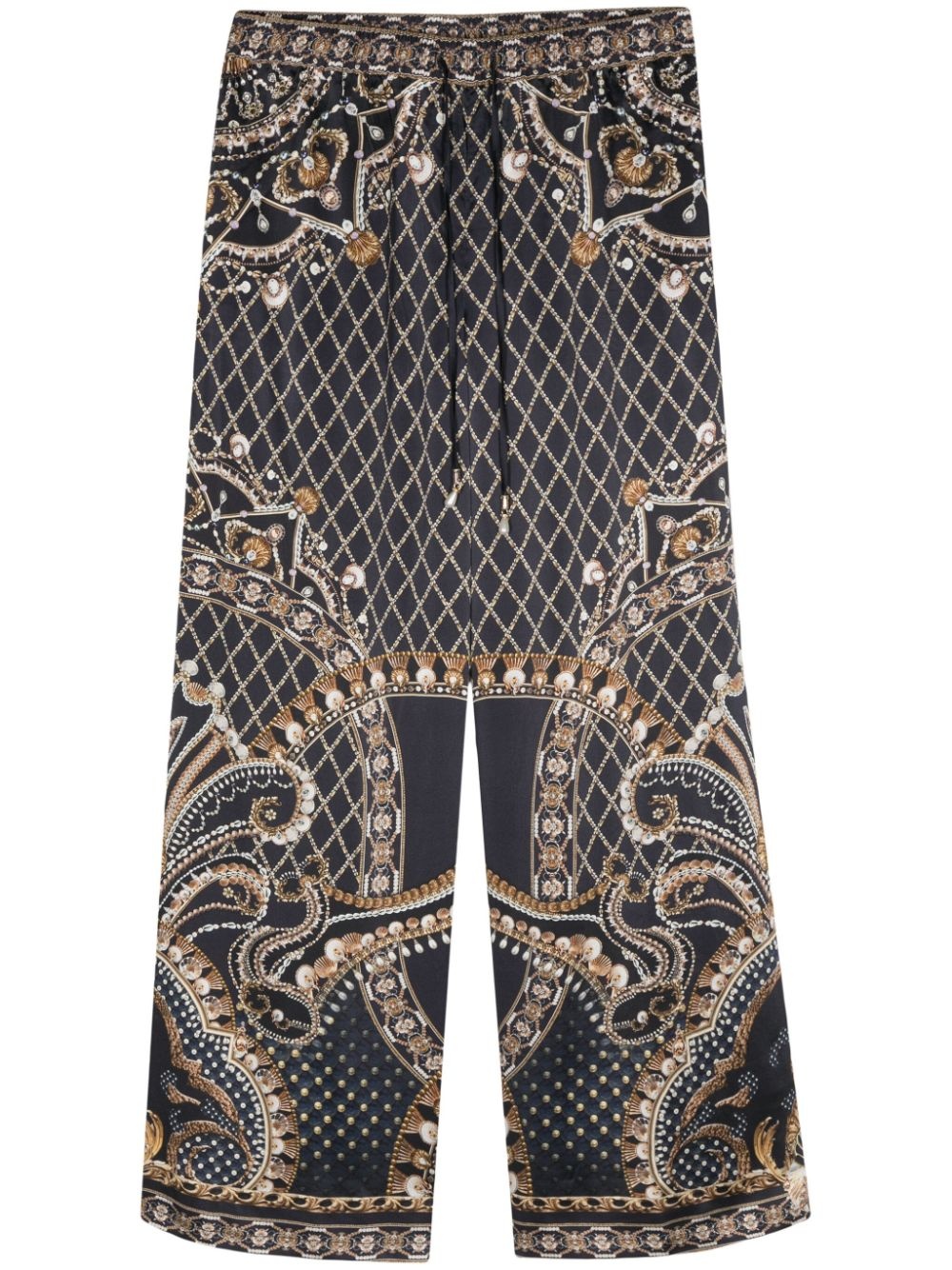 Dance with the Duke trousers Highlights - Navy blue/multicolour - Silk - Satin weave - All-over dance with the duke print - Elasticated waistband - Rhinestone embellishment - Faux-pearl detailing - Two side inset pockets - Flared cuffs - Drawstring waist Imported Composition Silk 100%