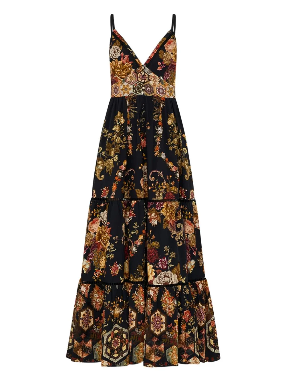floral print V-neck dress Highlights - Black - Floral print - V-neck - Adjustable straps - Tiered skirt - Flower buttons Imported Composition Cotton 100% Washing instructions Read Manufacturer Guidelines