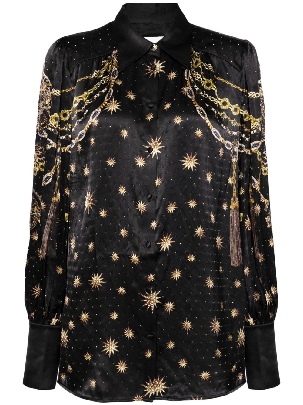 graphic-print silk shirt Highlights - Black/multicolour - Silk - Satin finish - All-over graphic print - Crystal embellishment - Classic collar - Front button fastening - Long sleeves - Buttoned-cuff sleeves - Curved hem Imported Composition Silk 100% SIZE & FIT Model measurements Height 5 ft 10 in(1.77 m) Bust/Chest 31.49 in(80 cm) Hips 35.43 in(90 cm) Waist 25.19 in(64 cm) FittingInformation Designed to be unstructured, offering a loose fit throughout Made from a lightweight non-stretch fabric This piece fits true to size – take your usual size Washing instructions Dry Clean Only