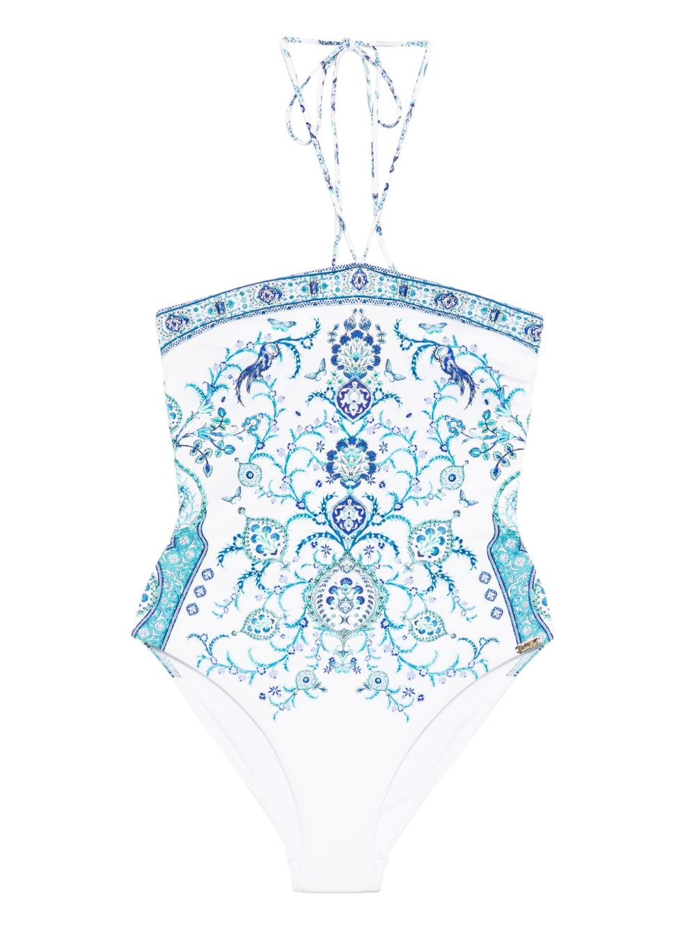 halter-neck paisley-print swimsuit Highlights - White - Paisley print - Halter neck - Bird motif - Blue details - Be mindful to try on swimwear over your own garments. Imported Composition Recycled Polyamide 82%, Elastane 18% Washing instructions Read Manufacturer Guidelines