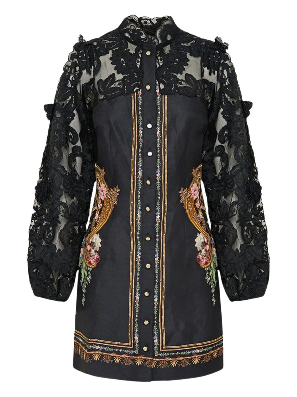 lace-sleeve floral print mini dress Highlights - Black - Lace sleeves - Floral print - Button fastening - High neck - Gathered waist Imported Composition Linen/Flax 82%, Silk 18% Washing instructions Read Manufacturer Guidelines