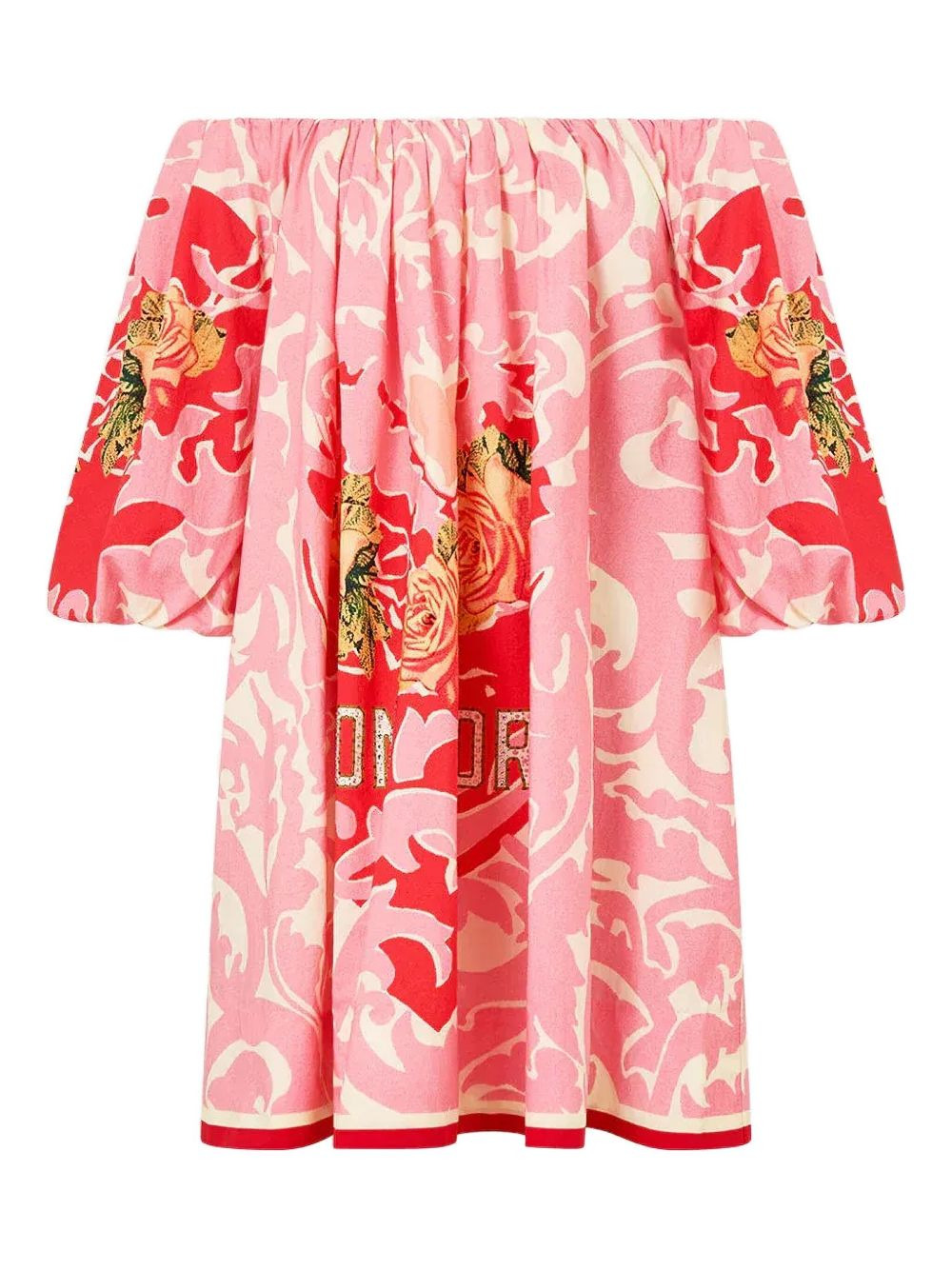 off-shoulder mini dress Highlights - Pink - Paisley print - Off-shoulder - Three-quarter sleeves - Mini length Imported Composition Cotton 100% Washing instructions Read Manufacturer Guidelines