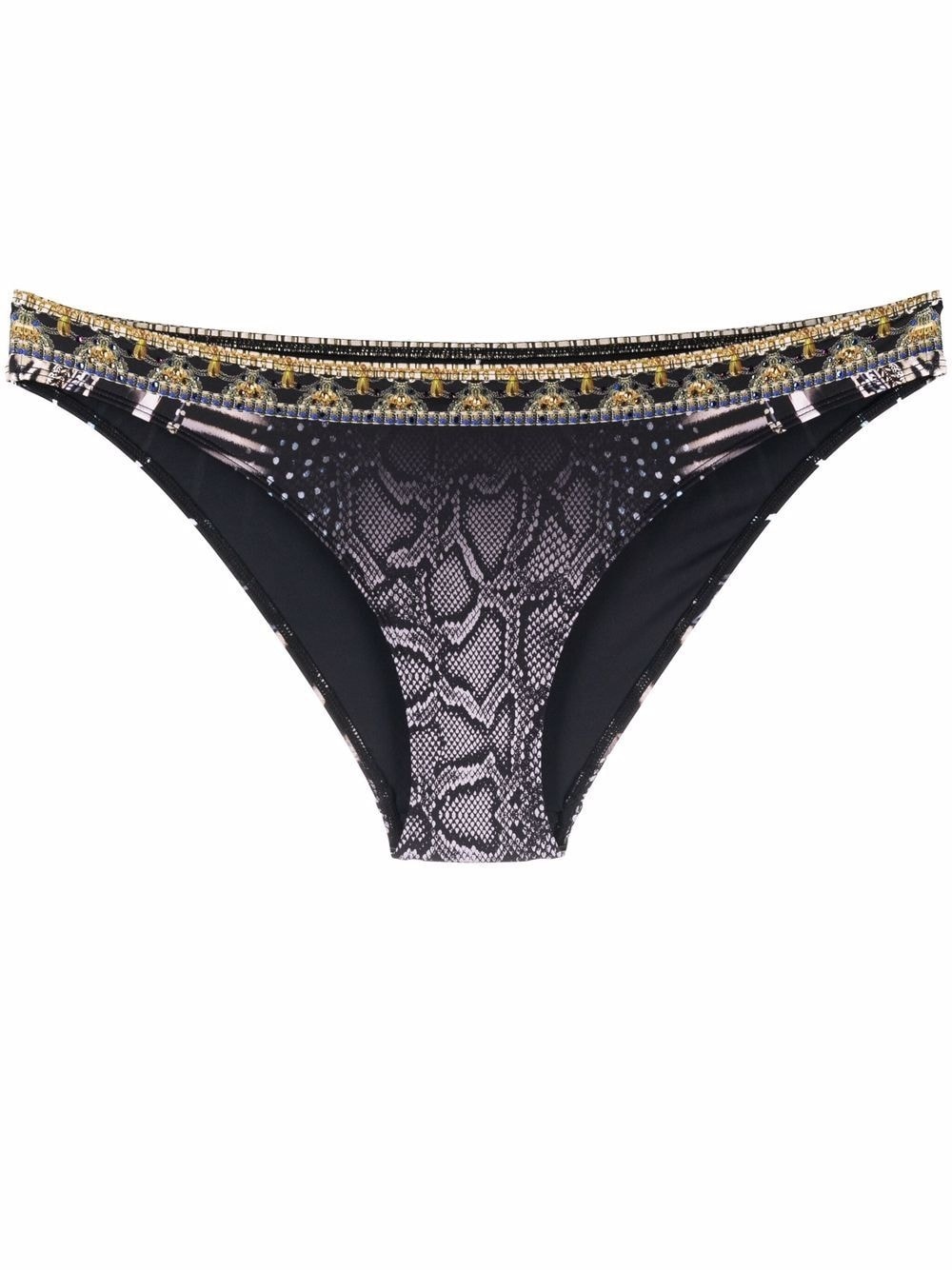 Quechua King Ball bikini briefs Sydney-based designer Camilla Frank presents these striking bikini briefs depicted in the brand's Quechua King motif, which takes inspiration from the Ancient Aztec civilization and blends lurex tiger, jaguar and serpent stripes. Highlights - Multicolour - Stretch-recycled polyamide - Snakeskin print - Crystal embellishment - Low-rise - Tonal stitching - Be mindful to try on swimwear over your own garments. Imported Composition Outer: Recycled Polyamide 82%, Elastane 18% Lining: Polyamide 90%, Spandex/Elastane 10%