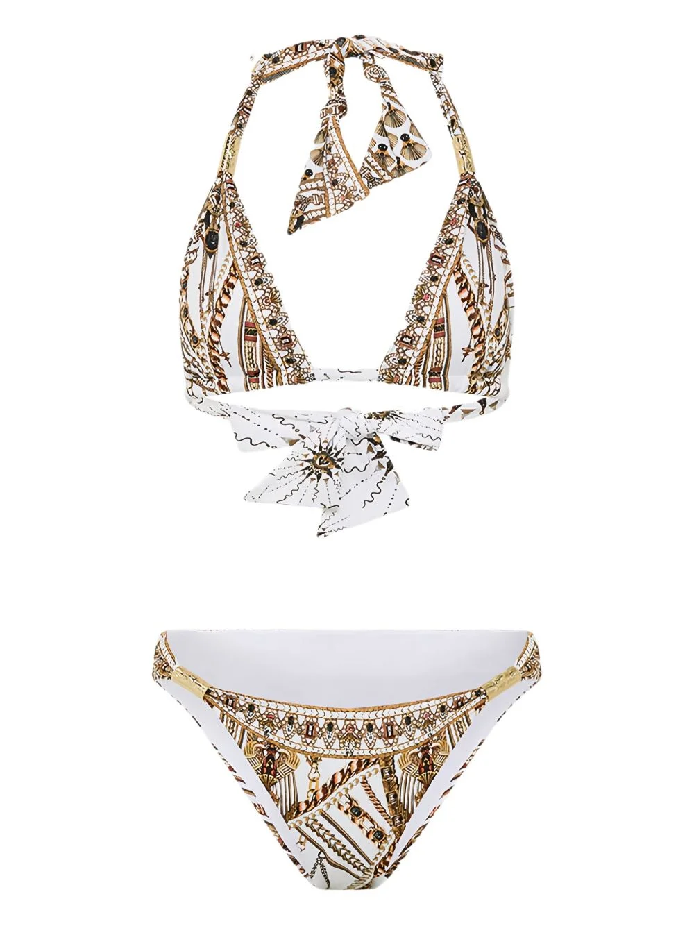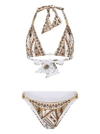 The Goddess Energy bikini Highlights - White - Gold-tone hardware - Patterned - Tie fastening at the neck and back - High cut bottoms - Be mindful to try on swimwear over your own garments. Imported Composition Fabric 100%