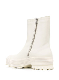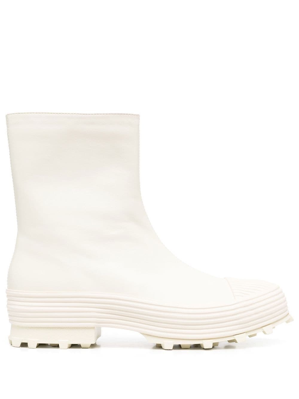Traktori leather ankle boots Highlights - White - Recycled polyester blend/leather - Almond toe - Rubber toecap - Side zip fastening - Flat rubber sole - Ankle-length Imported Composition Outer: Leather 95%, Rubber 5% Lining: Recycled Polyester 46%, Leather 17% Sole: Rubber 100% SIZE & FIT Measurement CIRCUMFERENCE 11.81 in(30 cm) HEEL 1.96 in(5 cm) HEIGHT 6.88 in(17.5 cm) Sole height 1.18 in(3 cm)