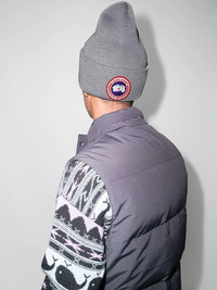 Arctic Disc ribbed-knit beanie Known for delivering garments that protect from cold weather, Canada Goose introduces this ribbed knit beanie. Crafted from grey wool, it is adorned with a signature Arctic Disc, making it instantly recognisable. Made in Italy Composition Wool 100% SIZE & FIT Model measurements Height 6 ft 2 in(1.89 m) Bust/Chest 36.22 in(92 cm) Hips 35.82 in(91 cm) Waist 28.74 in(73 cm) Measurement CIRCUMFERENCE 19.68 in(50 cm)
