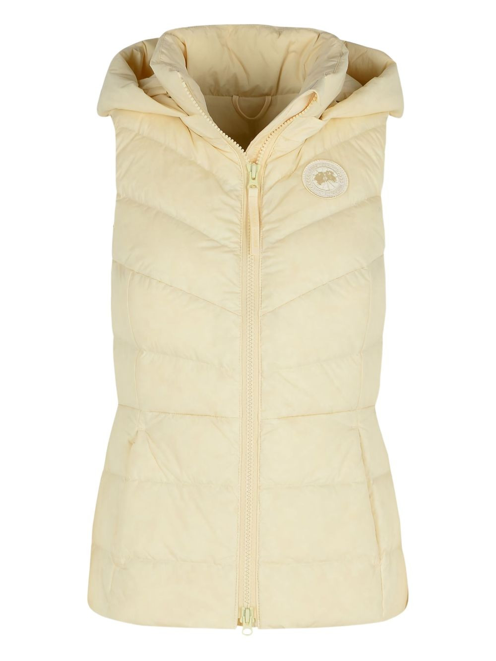 Calir hooded zip-front vest Highlights - Beige - Removable hood - Front zip closure - Side pockets - Logo patch - Quilted design Imported Composition Outer: Recycled Nylon 87%, Elastane 13% Lining: Goose Down 90%, Goose Feather 10% Washing instructions Read Manufacturer Guidelines