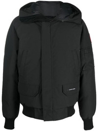 Chilliwack hooded bomber jacket Highlights - Black - Cotton blend - Down-feather filling - Logo patch at the sleeve - Logo patch to the front - Classic hood - Concealed front fastening - Long sleeves - Ribbed cuffs - Two side slit pockets - Two front flap pockets - Ribbed hem Imported Composition Lining: Polyamide 100%, Feather Down 100% Outer: Polyester 84%, Cotton 16% SIZE & FIT Model measurements Height 6 ft 2 in(1.87 m) Bust/Chest 36.41 in(92.5 cm) Hips 35.43 in(90 cm) Waist 29.52 in(75 cm) Measurement CHEST 51.96 in(132 cm) FittingInformation Designed for a relaxed fit, this piece allows for comfort and movement when worn The ribbed hem offers a close, comfortable fit Made from a padded non-stretch fabric, giving it no natural elasticity This piece fits true to size – take your usual size Washing instructions Dry Clean Only