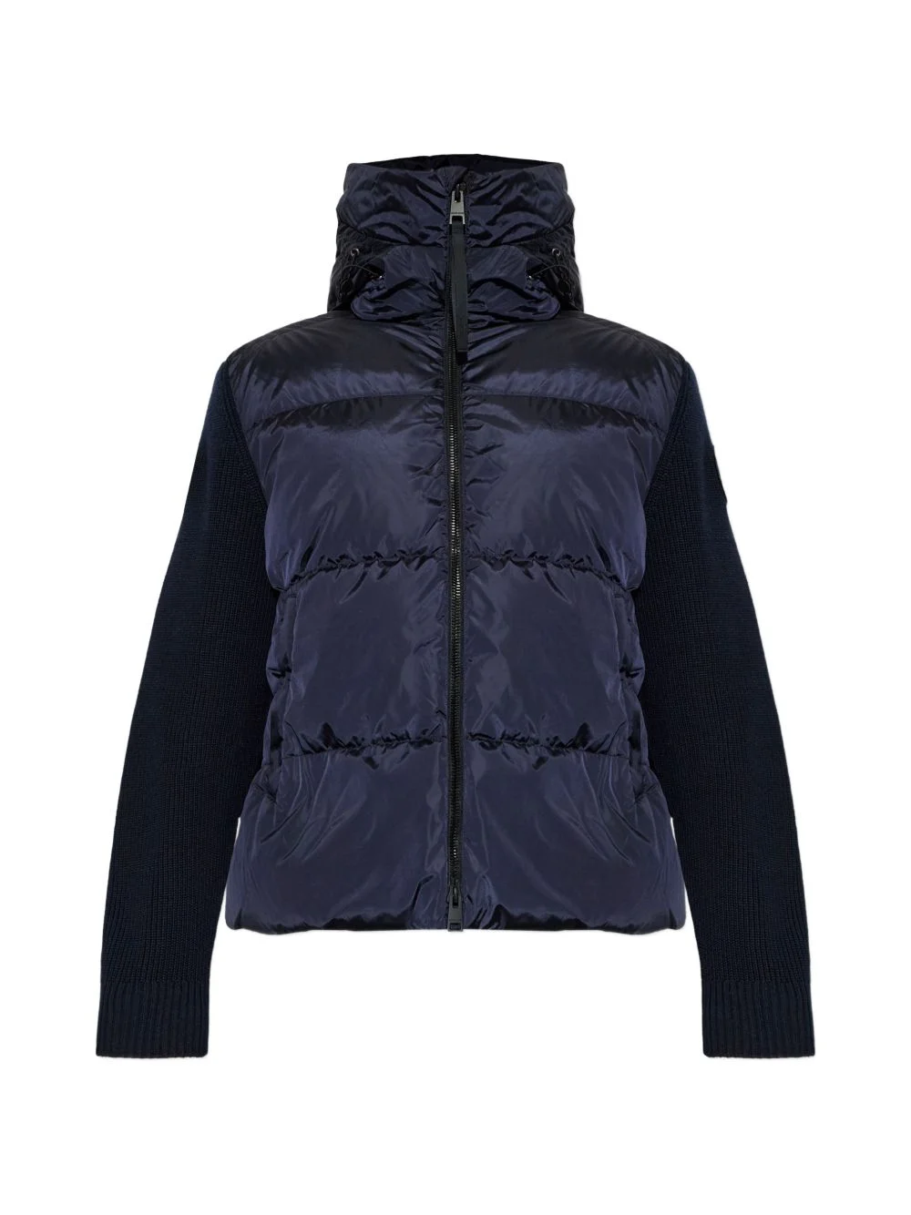 hooded panelled jacket Highlights - Dark blue - Panelled design - Hooded - Zip fastening - Logo patch - Knitted sleeves Imported Composition Polyamide 100% Washing instructions Read Manufacturer Guidelines