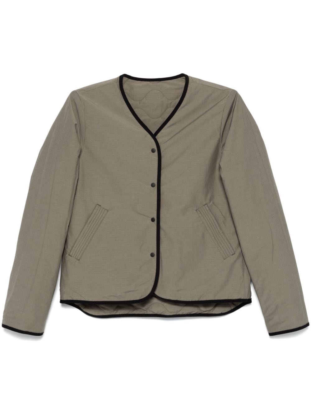 Annex Liner collarless jacket Highlights - Sage green - Textured finish - Quilted - Front press-stud fastening - V-neck - Long sleeves - Applique logo - Two side welt pockets - Straight hem Imported Composition Outer: Cotton 57%, Polyamide 43% Lining: Lyocell 100%, Cotton 57%, Polyamide 43% SIZE & FIT Model measurements Height 5 ft 9 in(1.75 m) Bust/Chest 31.88 in(81 cm) Hips 34.64 in(88 cm) Waist 24.01 in(61 cm) FittingInformation Designed for a relaxed fit, this piece allows for comfort and movement when worn Made from a quilted non-stretch fabric, giving it no natural elasticity