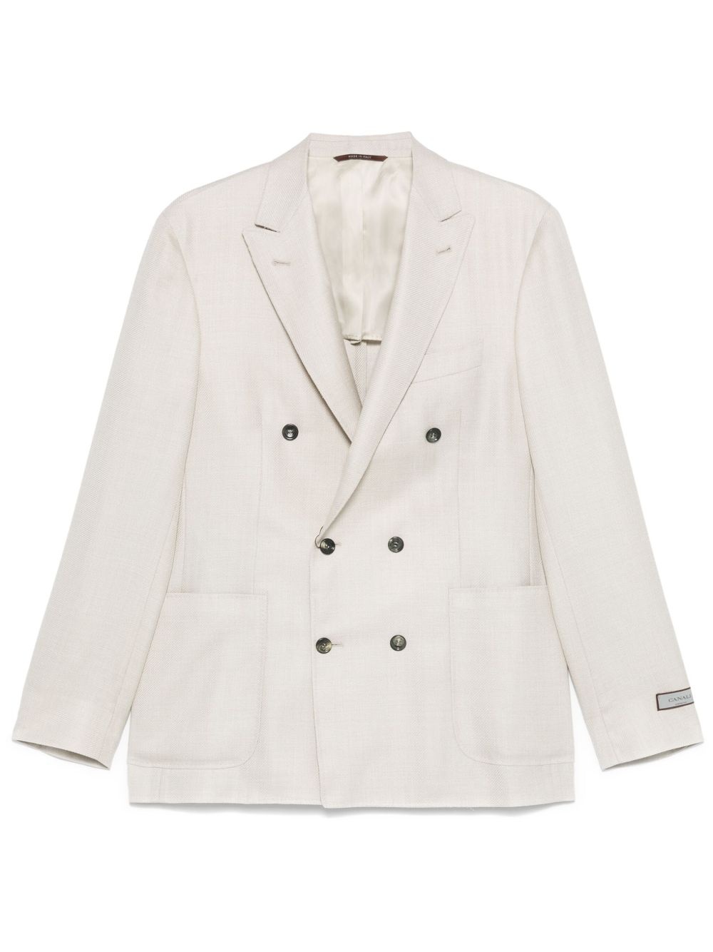 double-breasted blazer Highlights - Beige - Front button fastening - Chest welt pocket - Two side patch pockets - Buttoned cuffs Made in Italy Composition Outer: Wool 65%, Silk 21%, Linen/Flax 14% Lining: Cupro 100% SIZE & FIT Model measurements Height 6 ft 1 in(1.86 m) Bust/Chest 36.61 in(93 cm) Hips 37 in(94 cm) Waist 28.74 in(73 cm) FittingInformation Designed for a slim fit, offering a comfortable fit that sits just away from the body The vented hem offers movement at the rear Made from a midweight non-stretch fabric Washing instructions Dry Clean Only