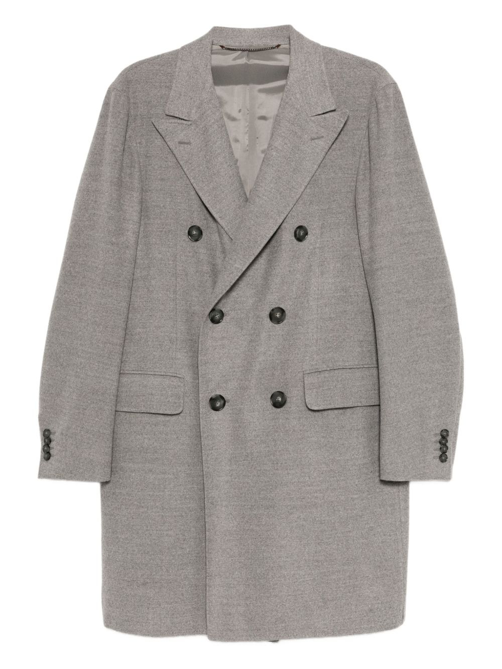 double-breasted wool coat Highlights - Steel grey - Front button fastening - Two front flap pockets - Buttoned-cuff sleeves Made in Italy Composition Wool 100% Washing instructions Read Manufacturer Guidelines