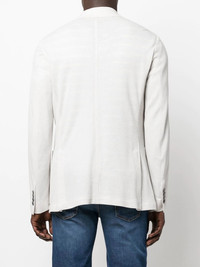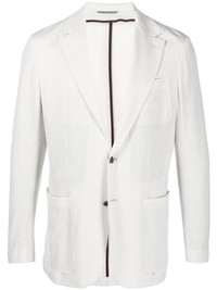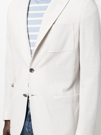 fitted single-breasted button blazer cloud white cotton classic lapels front button fastening long sleeves chest patch pocket two front patch pockets Made in Italy Composition Outer: Cotton 86%, Polyester 14% Lining: Acetate 65%, Polyester 35% SIZE & FIT Model measurements Height 6 ft 0 in(1.84 m) Bust/Chest 35.82 in(91 cm) Hips 37 in(94 cm) Waist 28.34 in(72 cm) FittingInformation This piece fits true to size. We recommend you get your regular size Cut for a slim fit Made with a mid-weight fabric Washing instructions Dry Clean Only