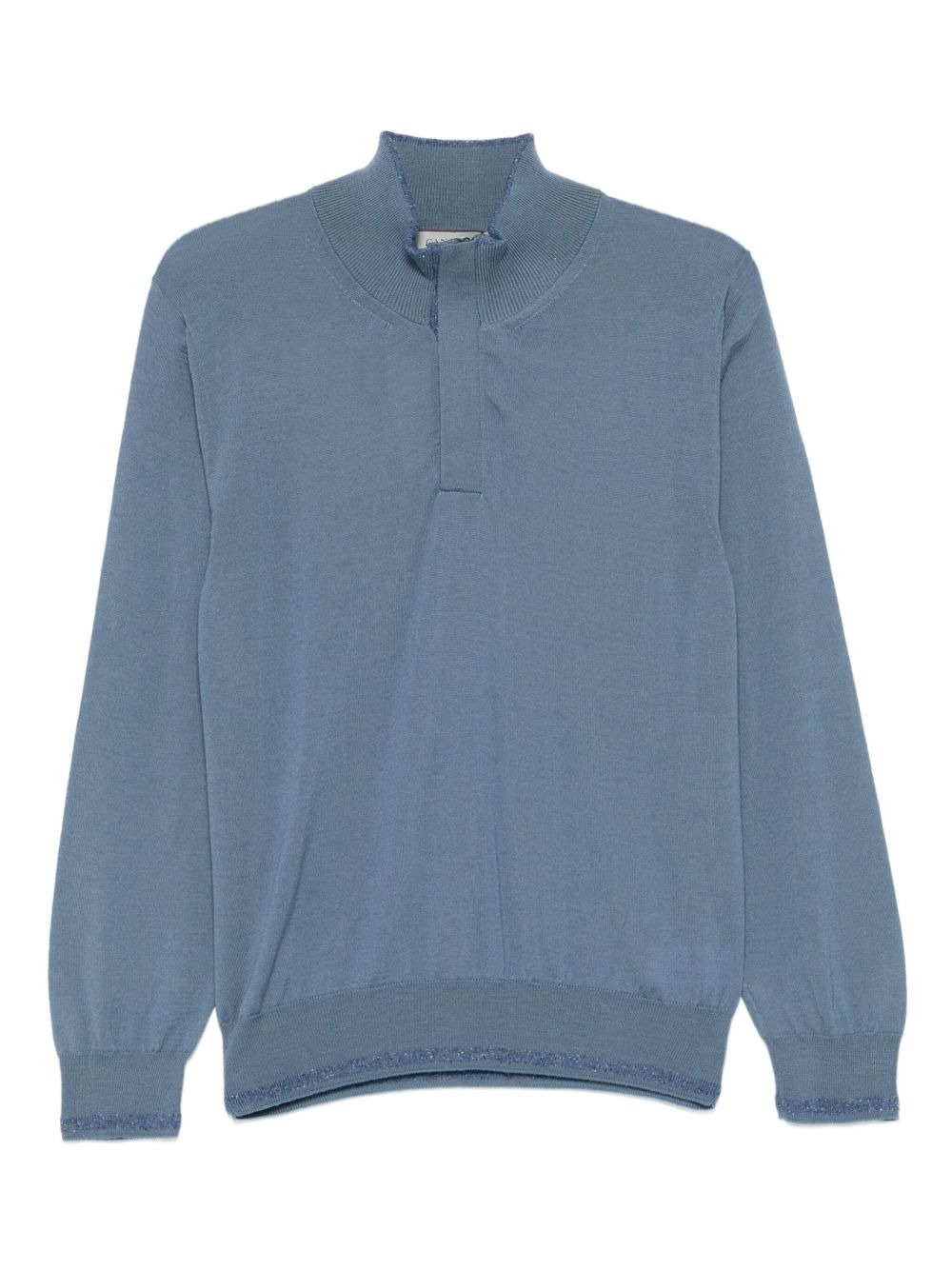 high-neck half-placket sweater Highlights - Blue - High neck - Half placket - Long sleeves - Ribbed cuffs - Ribbed hem Made in Italy Composition Wool 97%, Silk 1%, Viscose 1%, Polyamide 1% SIZE & FIT Model measurements Height 6 ft 0 in(1.84 m) Bust/Chest 37.79 in(96 cm) Hips 37 in(94 cm) Waist 31.49 in(80 cm)