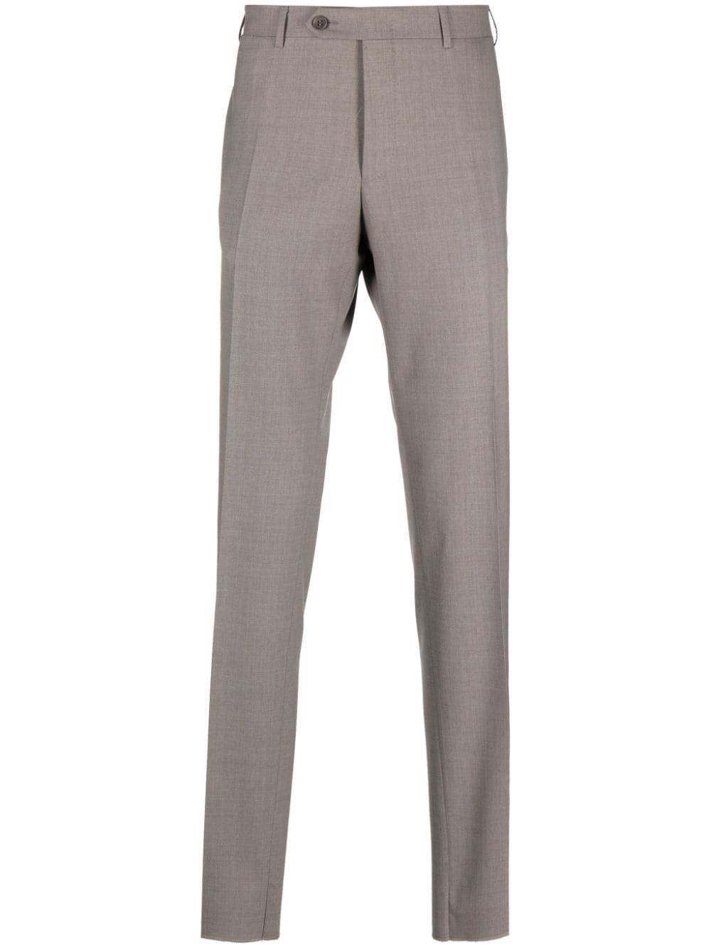 mid-rise tailored tapered trousers Highlights - Taupe - Stretch-wool - Slub texture - Mid-rise - Belt loops - Pressed crease - Off-centre front button fastening - Two side slash pockets - Two rear button-fastening jetted pockets - Tapered leg - Tailored cut Made in Italy Composition Wool 95%, Elastane 5% SIZE & FIT Model measurements Height 6 ft 2 in(1.87 m) Bust/Chest 38.18 in(97 cm) Hips 36.61 in(93 cm) Waist 29.13 in(74 cm) FittingInformation Designed for a slim fit, offering a comfortable fit that sits just away from the leg The unfinished hems allow for the length to be altered Made from a midweight stretch fabric, this piece offers elasticity and flexibility when worn This piece fits true to size – take your usual size Washing instructions Dry Clean Only