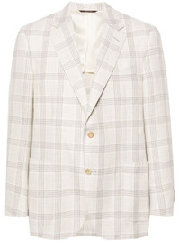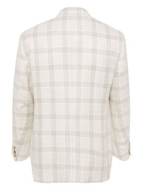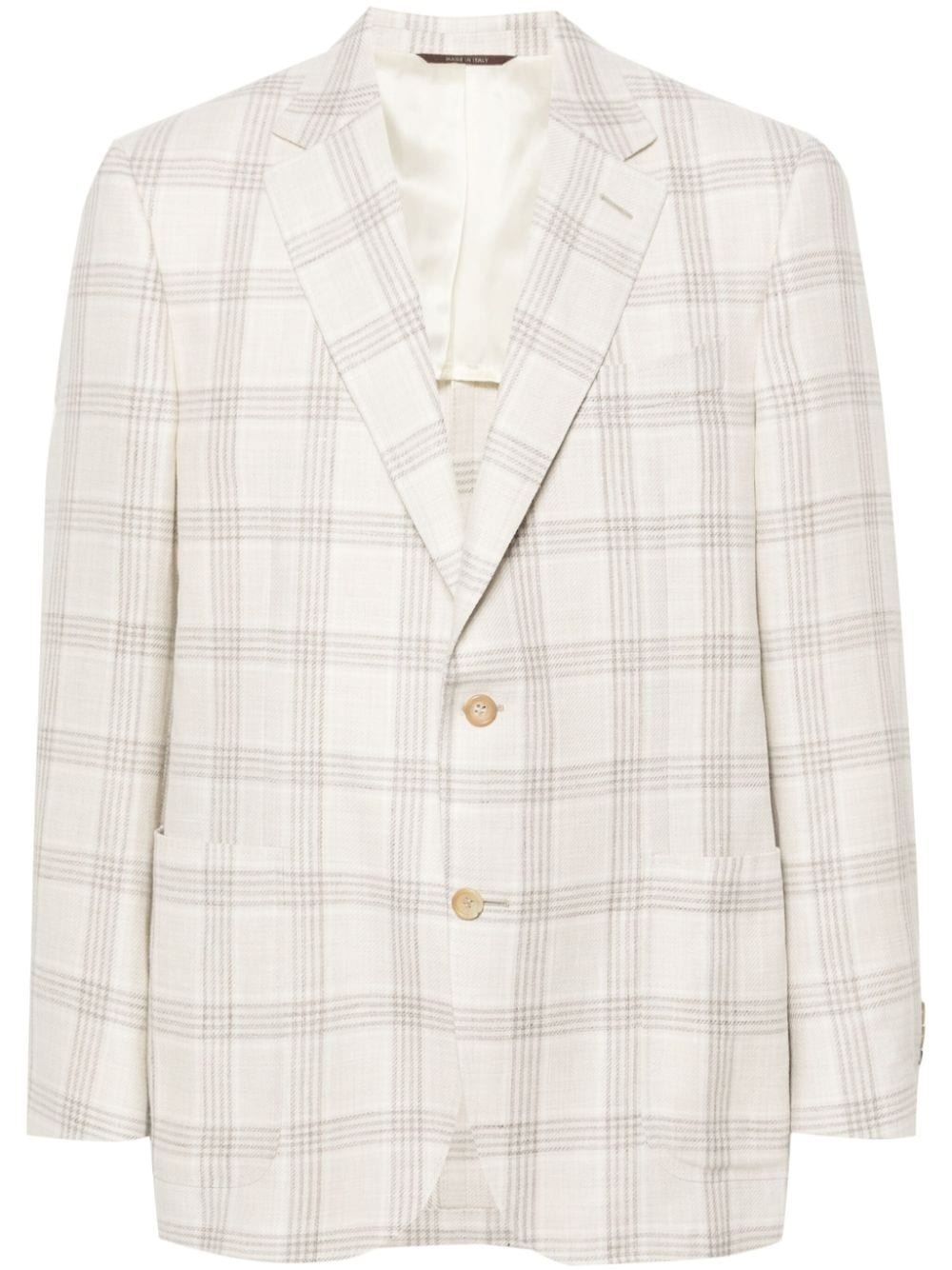 single-breasted blazer Highlights - Ivory white/grey - Linen-wool blend - Plaid check pattern - Twill weave - Notched lapels - Long sleeves with buttoned cuffs - Chest welt pocket - Two side patch pockets - English rear vents - Multiple internal slip pockets - Internal logo patch - Curved hem - Front button fastening Made in Italy Composition Outer: Linen/Flax 60%, Wool 40% Lining: Cupro 100%