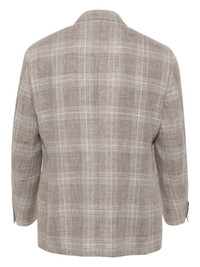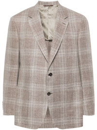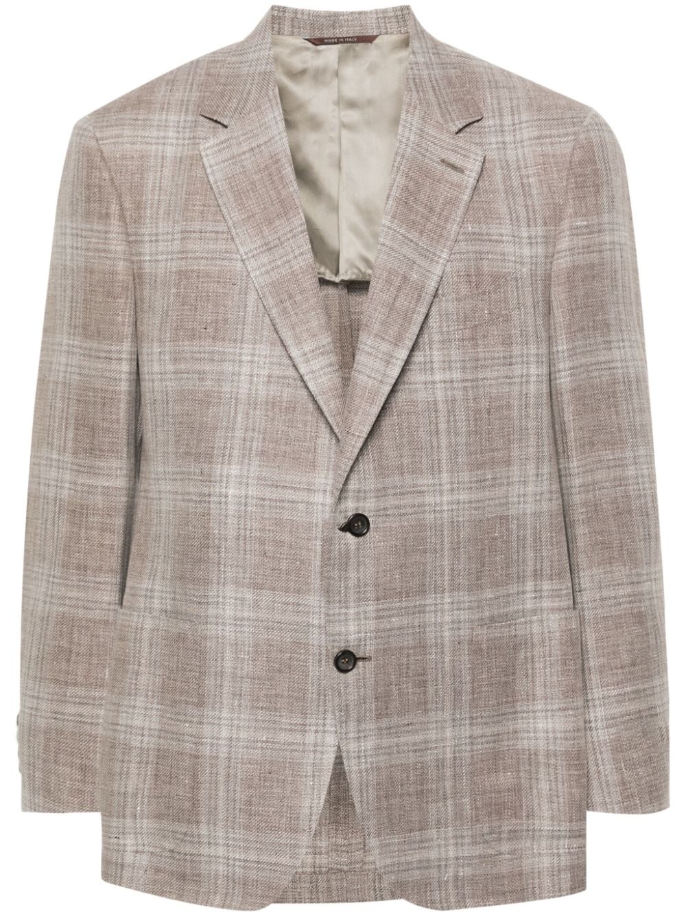 single-breasted blazer Highlights - Light brown/white - Linen-wool blend - Plaid check pattern - Notched lapels - Long sleeves with buttoned cuffs - Logo patch at the sleeve - Chest welt pocket - Two side patch pockets - English rear vents - Multiple internal slip pockets - Internal logo patch - Curved hem - Front button fastening Made in Italy Composition Outer: Linen/Flax 60%, Wool 40% Lining: Cupro 100%