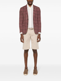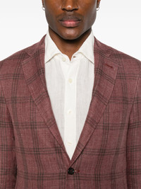 single-breasted checked blazer Highlights - Deep pink - Linen-wool blend - Check pattern - Notched lapels - Long sleeves with buttoned cuffs - Chest welt pocket - Two front flap pockets - English rear vents - Internal slip pocket - Partial lining - Front button fastening Made in Italy Composition Outer: Linen/Flax 60%, Wool 40% Lining: Cupro 100% SIZE & FIT Model measurements Height 6 ft 2 in(1.89 m) Bust/Chest 39.76 in(101 cm) Hips 37.4 in(95 cm) Waist 29.92 in(76 cm) FittingInformation Designed for a slim fit, offering a comfortable fit that sits just away from the body The vented hem offers movement at the rear Made from a midweight non-stretch fabric This piece fits true to size – those with broad shoulders may wish to take one size up
