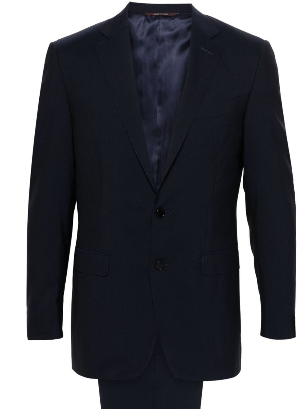 single-breasted wool suit Highlights - Midnight blue - Wool - Blazer: - Notched lapels - Shoulder pads - Chest welt pocket - Long sleeves with faux buttoned cuffs - Logo tag to the cuff - Dart detailing - Two side flap pockets - English rear vents - Multiple internal slip pockets - Full lining - Straight hem - Front button fastening - Trousers: - Belt loops - Two side slash pockets - Pressed crease - Full-length - Two rear button-fastening jetted pockets - Slim cut - Front concealed zip-fly and button fastening Made in Italy Composition Lining: Cupro 100% Outer: Wool 100% SIZE & FIT Model measurements Height 6 ft 1 in(1.86 m) Bust/Chest 37.4 in(95 cm) Hips 36.22 in(92 cm) Waist 29.52 in(75 cm) FittingInformation Tailored for a slim fit, offering a comfortable fit that sits just away from the body The unfinished hems allow for the length to be altered Made from a midweight non-stretch fabric This piece fits true to size – take your usual size Washing instructions Dry Clean Only