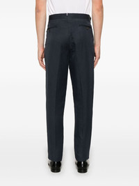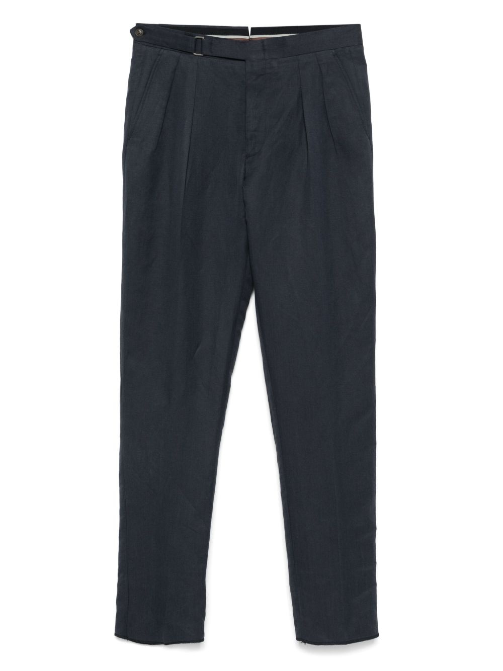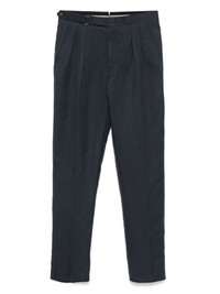 tailored trousers Highlights - Navy blue - Front button and zip fastening - Buckle-strap fastening - Two side slit pockets - Two rear button-fastening jetted pockets Made in Italy Composition Linen/Flax 57%, Silk 43% SIZE & FIT Model measurements Height 6 ft 2 in(1.87 m) Bust/Chest 38.97 in(99 cm) Hips 37.99 in(96.5 cm) Waist 29.52 in(75 cm) FittingInformation Designed for a tapered leg, offering a loose unrestricted fit over the leg with a closer fit towards the ankle The unfinished hems allow for the length to be altered Made from a midweight non-stretch fabric Washing instructions Dry Clean Only