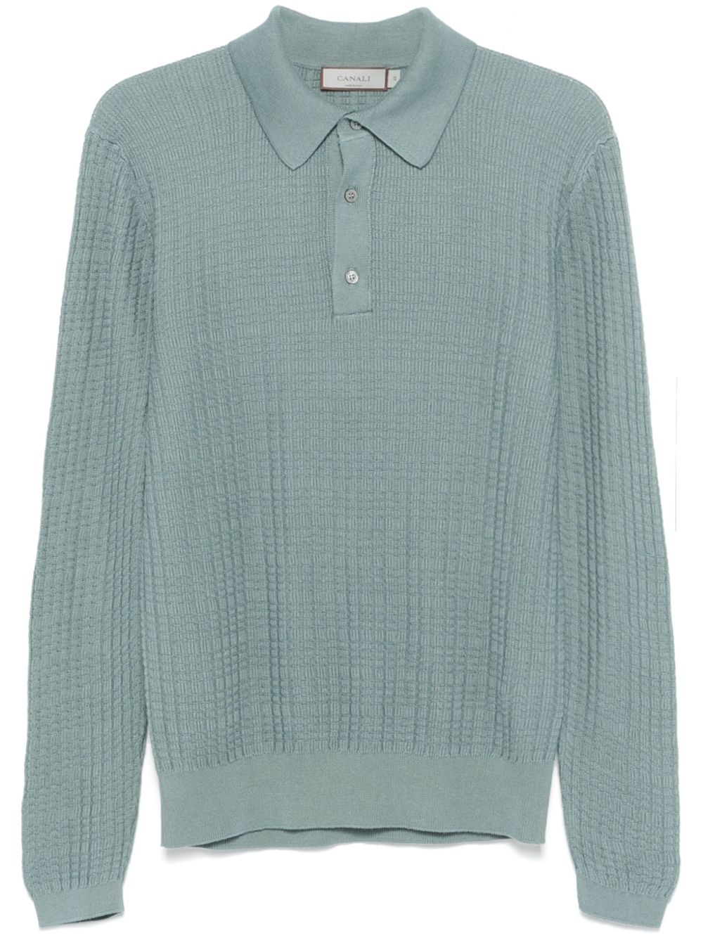 textured knit polo shirt Highlights - Sea green - Short front button fastening - Ribbed cuffs and hem - Long sleeves Made in Italy Composition Cotton 50%, Modal 50% SIZE & FIT Model measurements Height 6 ft 2 in(1.87 m) Bust/Chest 36.41 in(92.5 cm) Hips 37 in(94 cm) Waist 29.52 in(75 cm) FittingInformation Designed for a slim fit, this polo shirt offers a comfortable fit that sits just away from the body The ribbed hem offers a close, comfortable fit Made with a lightweight knit, this piece offers some stretch