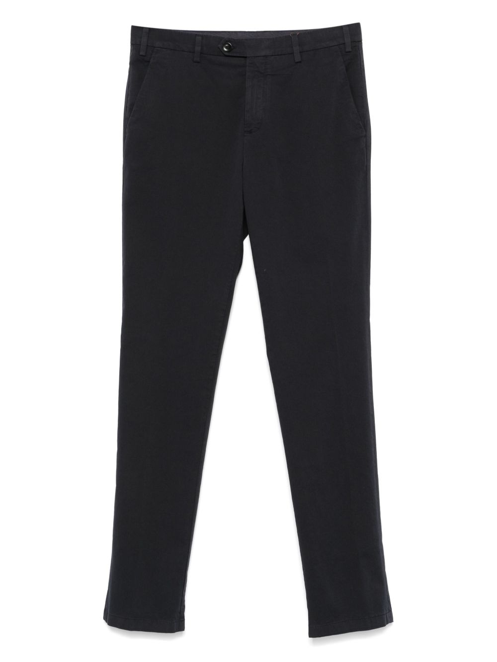 twill chinos Highlights - Midnight blue - Concealed front button, hook and zip fastening - Two side slit pockets - Two rear button-fastening jetted pockets - Pressed crease Made in Italy Composition Lining: Cotton 100% Outer: Cotton 98%, Spandex/Elastane 2%
