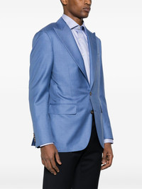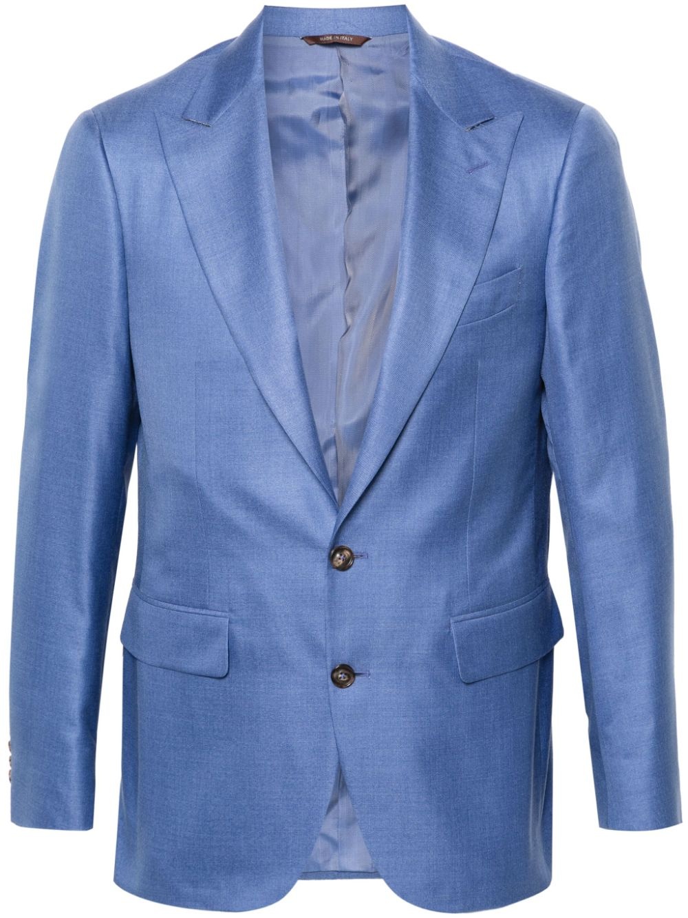 twill melange blazer Highlights - Light blue - Cashmere-silk blend - Twill weave - Melange effect - Dart detailing - Peak lapels - Shoulder pads - Long sleeves - Buttoned cuffs - Chest welt pocket - Two front flap pockets - Multiple internal jetted pockets - Front button fastening - Curved hem - Full lining Made in Italy Composition Outer: Cashmere 60%, Silk 40% Lining: Cupro 100% SIZE & FIT Model measurements Height 6 ft 2 in(1.88 m) Bust/Chest 35.03 in(89 cm) Hips 35.82 in(91 cm) Waist 27.95 in(71 cm) FittingInformation Designed for a slim fit, offering a comfortable fit that sits just away from the body The internal shoulder pads offer a structured shape Made from a midweight non-stretch fabric This piece fits true to size – take your usual size