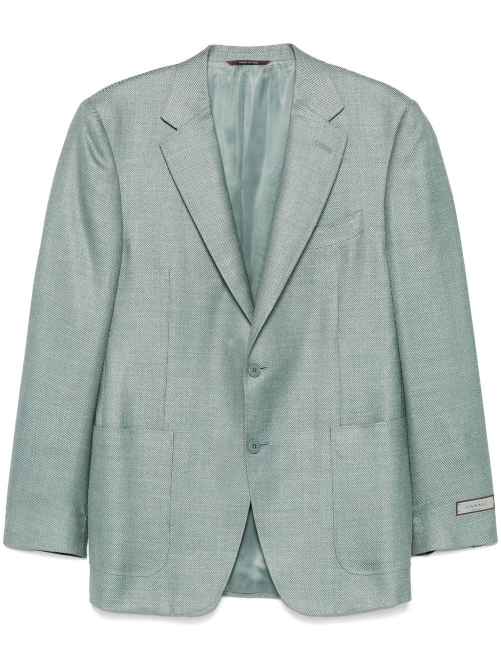 twill-weave blazer Highlights - Duck egg blue - Front button fastening - Chest welt pocket - Two side patch pockets - English rear vents Made in Italy Composition Outer: Wool 65%, Silk 21%, Linen/Flax 14% Lining: Cupro 100% SIZE & FIT Model measurements Height 6 ft 2 in(1.87 m) Bust/Chest 38.18 in(97 cm) Hips 36.61 in(93 cm) Waist 29.13 in(74 cm) FittingInformation Designed for a slim fit, offering a comfortable fit that sits just away from the body The internal shoulder pads offer a structured shape Made from a midweight non-stretch fabric