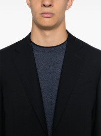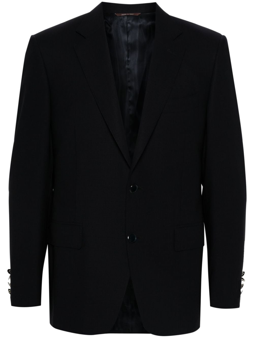 wool blazer Highlights - Navy blue - Wool - Interlock weave - Front button fastening - Notched lapels - Long sleeves - Buttoned-cuff sleeves - Chest welt pocket - Two side flap pockets - English rear vents - Multiple internal slip pockets - Full lining - Straight hem Made in Italy Composition Lining: Cupro 100% Outer: Wool 100% SIZE & FIT Model measurements Height 6 ft 1 in(1.86 m) Bust/Chest 36.61 in(93 cm) Hips 37 in(94 cm) Waist 28.74 in(73 cm) FittingInformation Designed for a slim fit, offering a comfortable fit that sits just away from the body The internal shoulder pads offer a structured shape Made from a midweight non-stretch fabric
