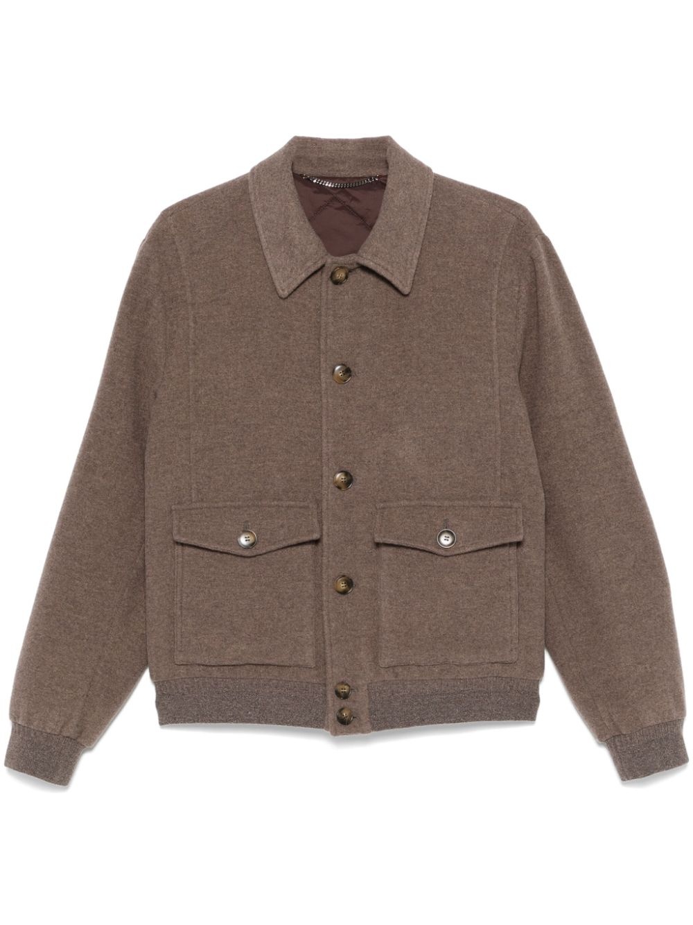wool jacket Highlights - Taupe brown - Wool - Padded design - Felted finish - Front button fastening - Classic collar - Long sleeves - Ribbed cuffs - Two front flap pockets - Internal zip-fastening pocket - Quilted lining - Ribbed hem Made in Italy Composition Lining: Nylon 100%, Polyester 100%, Cotton 100%, Wool 40%, Viscose 30%, Polyamide 14%, Cashmere 10%, Elastane 10% Outer: Wool 100% SIZE & FIT Model measurements Height 6 ft 1 in(1.85 m) Bust/Chest 35.82 in(91 cm) Hips 37.79 in(96 cm) Waist 29.13 in(74 cm) FittingInformation Designed for a regular fit, allowing for a comfortably loose fit throughout the body The ribbed hem offers a close, comfortable fit Made from a padded non-stretch fabric, giving it no natural elasticity