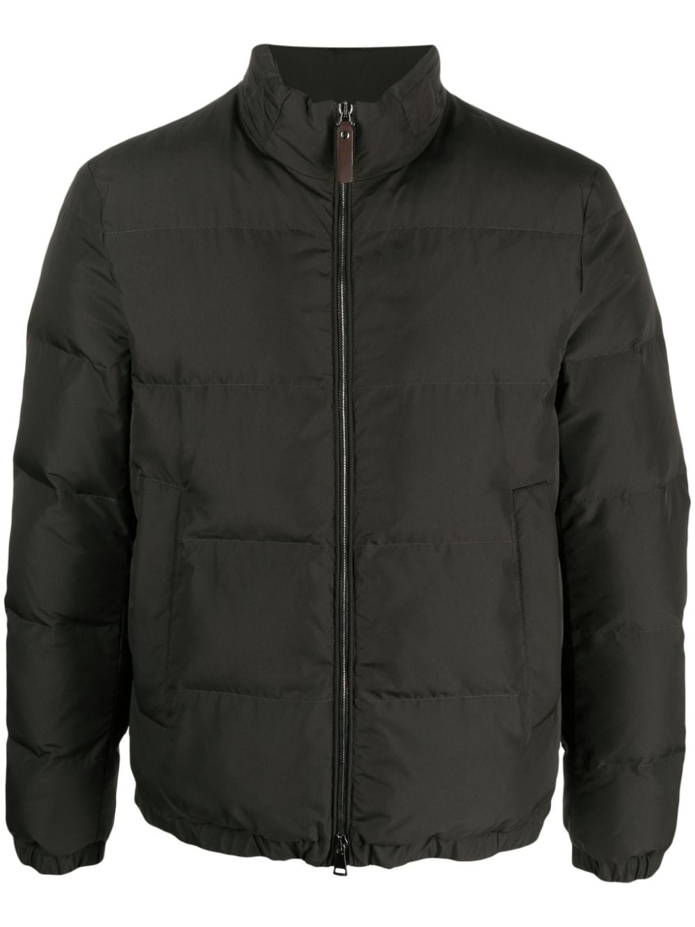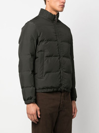 zip-up padded jacket Highlights - Dark green - Padded design - High neck - Front zip fastening - Long sleeves - Elasticated cuffs - Straight hem - Two side slit pockets - Leather tag - Cotton lining Made in Italy Composition Lining: Polyester 100%, Cotton 100% Outer: Polyester 100%, Calf Leather 100% SIZE & FIT Model measurements Height 6 ft 2 in(1.89 m) Bust/Chest 37.4 in(95 cm) Hips 35.03 in(89 cm) Waist 27.95 in(71 cm) FittingInformation Designed for a slim fit, offering a comfortable fit that sits just away from the body The elasticated hem allows for movement and a comfortable fit Made from a padded non-stretch fabric, giving it no natural elasticity This piece fits true to size – take your usual size Washing instructions Hand Wash