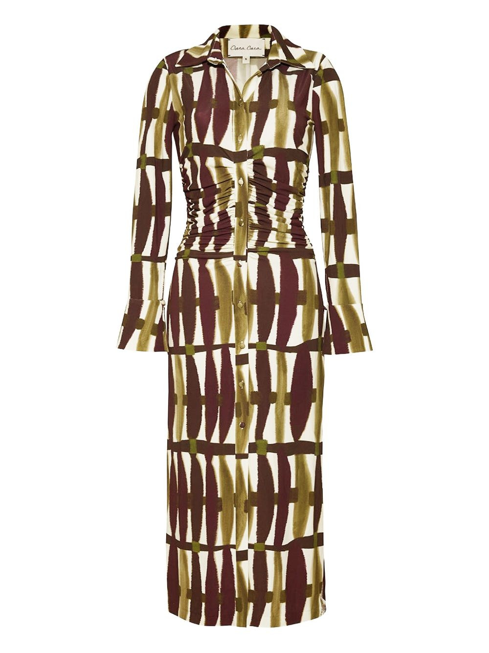 abstract-print midi dress Highlights - Olive green - Abstract print - Button front - Long sleeves - Fluted cuffs Imported Composition Polyester 93%, Spandex/Elastane 7% Washing instructions Read Manufacturer Guidelines