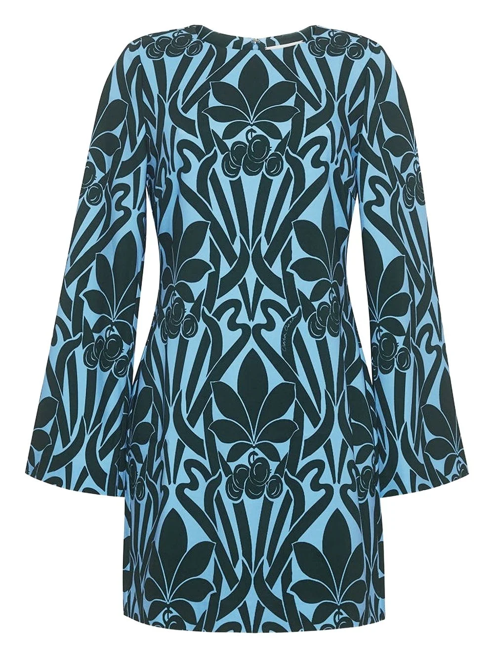 bell-sleeve floral-print mini dress Highlights - Light blue - Floral print - Bell sleeves - Round neck - Mini length - A-line shape Imported Composition Viscose 95%, Spandex/Elastane 5% Washing instructions Read Manufacturer Guidelines