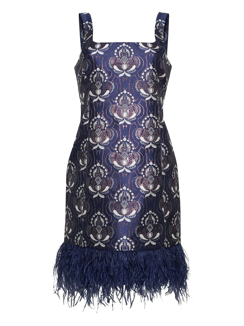 Carlie feather-trimmed mini dress Highlights - Navy blue - Patterned jacquard - Metallic threading - Square neckline - Sleeveless - Feather trim Imported Composition Outer: Fabric 100% Washing instructions Read Manufacturer Guidelines