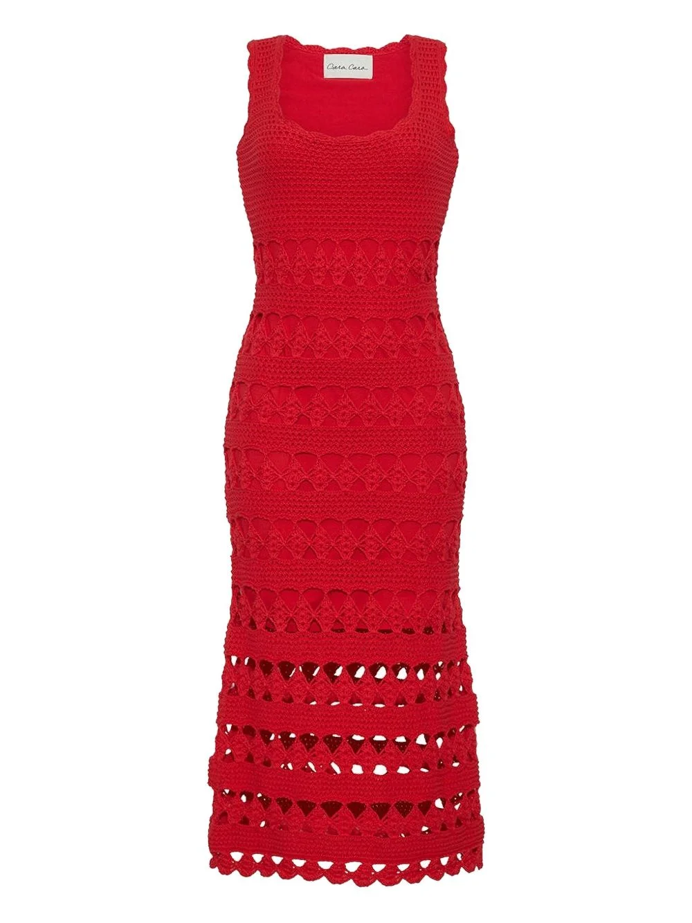 crochet midi day dress Highlights - Red - Crochet knit - Sleeveless - Scalloped hem - Midi length - Open knit pattern Imported Composition Cotton 100% Washing instructions Read Manufacturer Guidelines