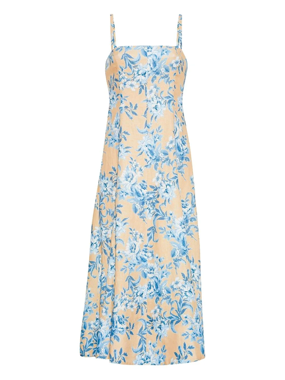 floral-print flared midi day dress Highlights - Yellow - Floral print - Thin straps - A-line skirt - Square neckline Imported Composition Lining: Cotton 100% Outer: Linen/Flax 100% Washing instructions Read Manufacturer Guidelines
