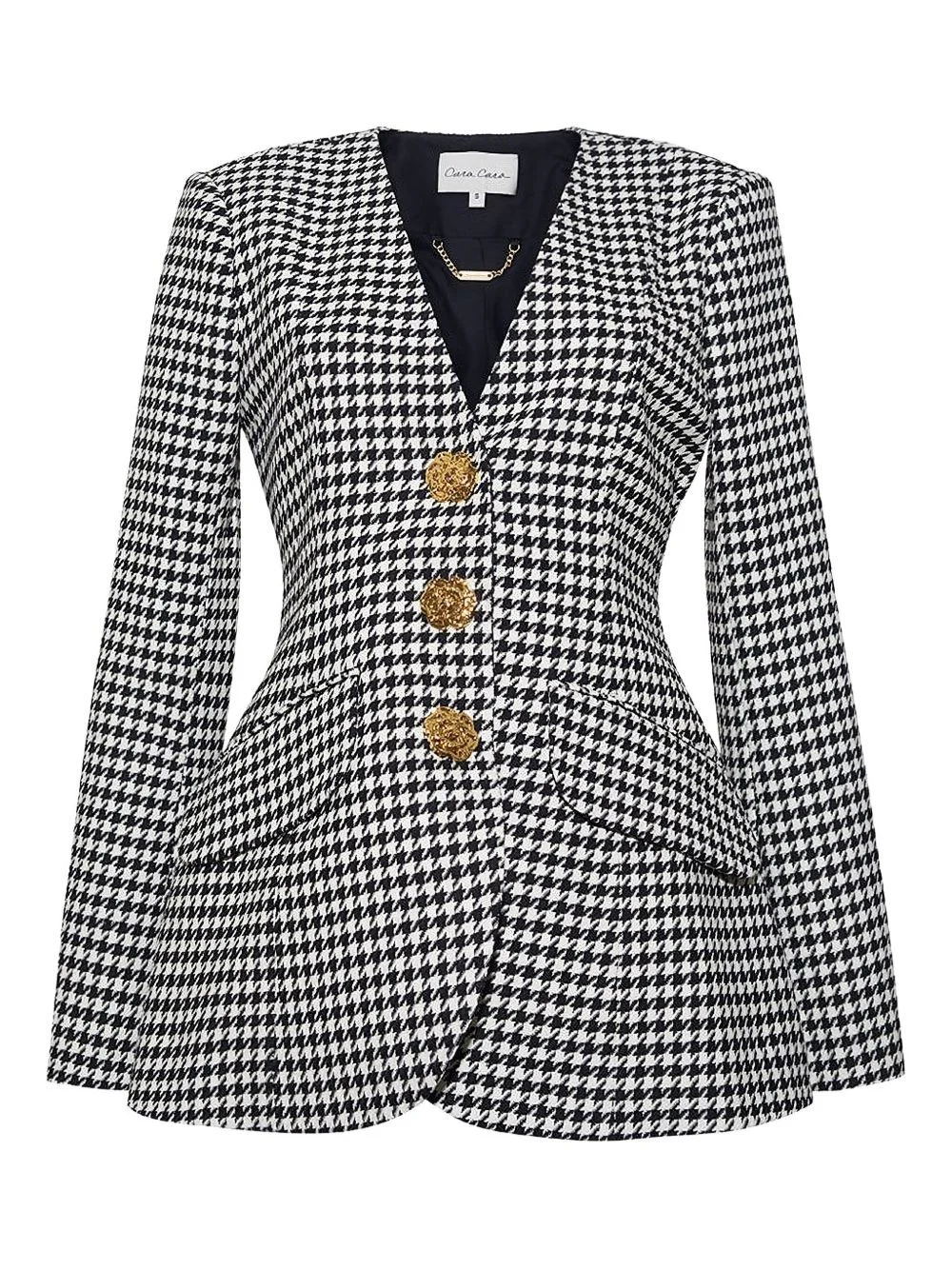 houndstooth single-breasted blazer Highlights - Black and white - Houndstooth pattern - Gold-tone buttons - Cinched waist - Sculpted flare Imported Composition Wool 85%, Polyester 15% Washing instructions Read Manufacturer Guidelines