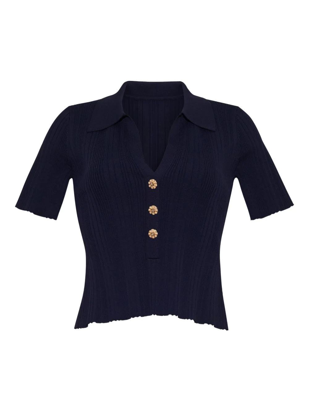 Ivanna polo top Highlights - Navy blue - Ribbed texture - Short sleeves - Polo collar - Front button placket - Gold-tone buttons Imported Composition Viscose 72%, Nylon 27%, Spandex/Elastane 1% Washing instructions Read Manufacturer Guidelines