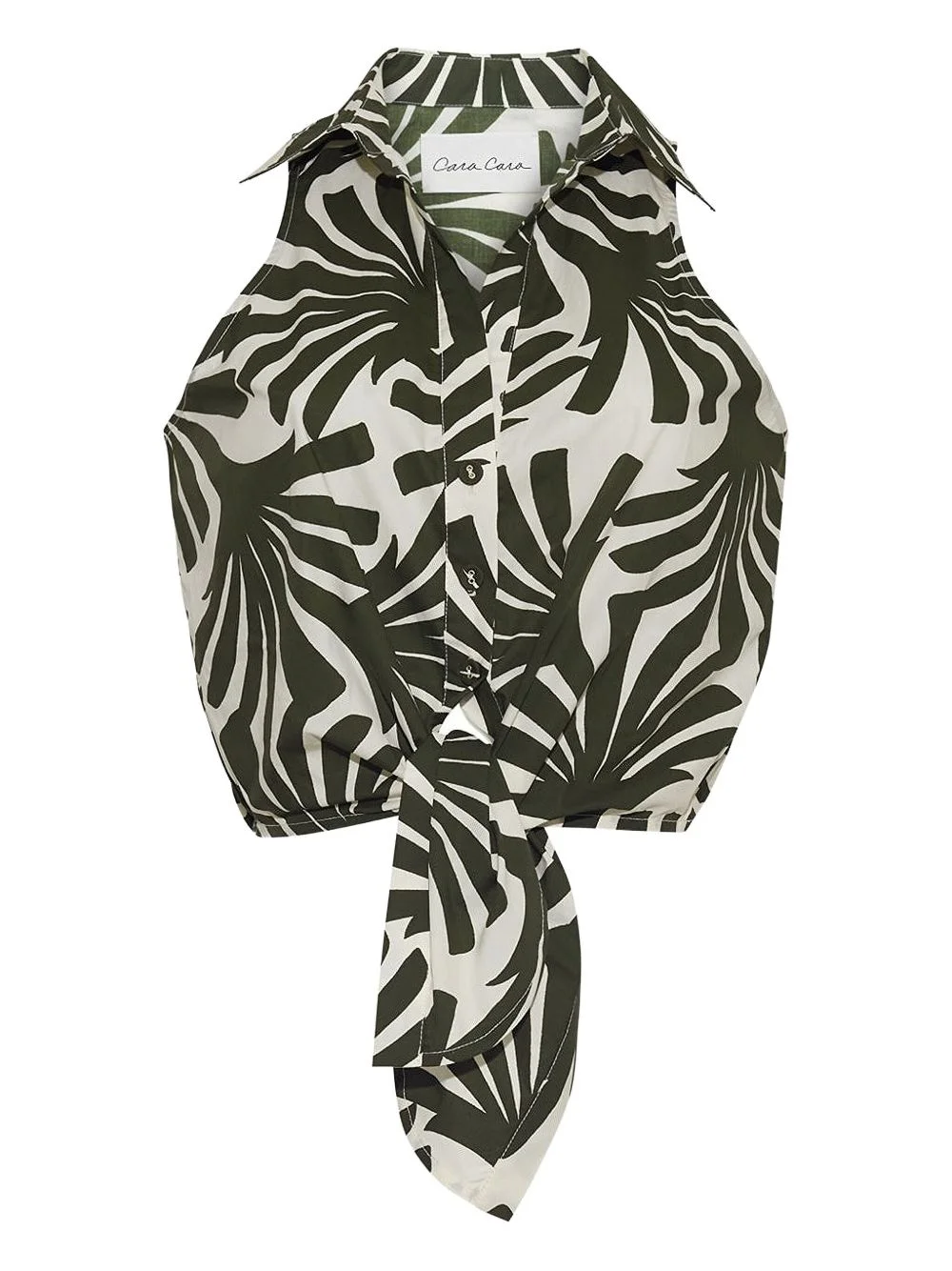 leafs-print tie-front shirt Highlights - Olive green - Leafs print - Button front - Sleeveless - Tie front - Collared neck Imported Composition Cotton 100% Washing instructions Read Manufacturer Guidelines